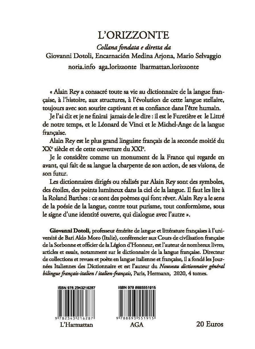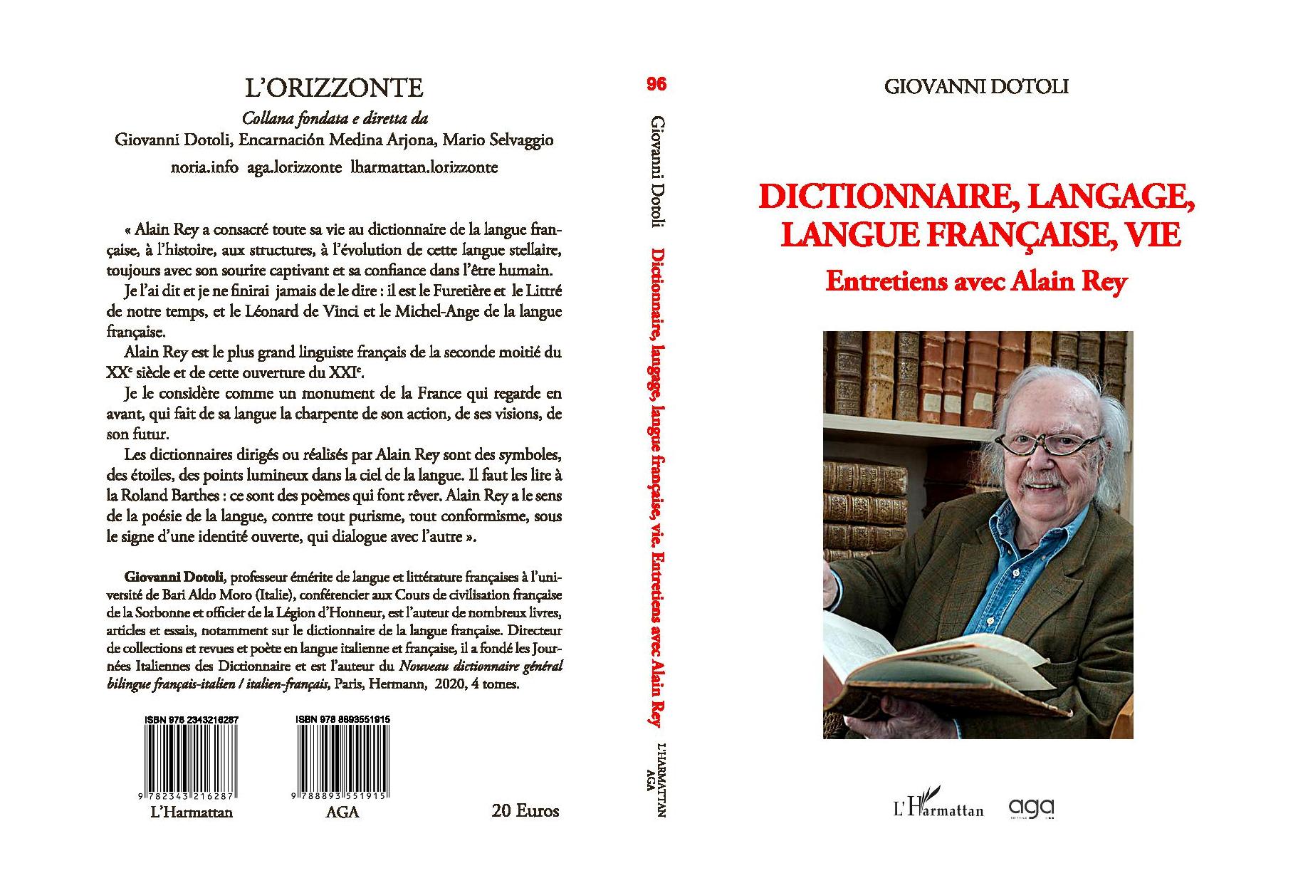 Giovanni Dotoli, Dictionnaire, langage, langue française, Vie. Entretiens avec Alain Rey, Paris – Alberobello, L’Harmattan – Editrice AGA, « L’Orizzonte n. 96 », 2020, 148 p.