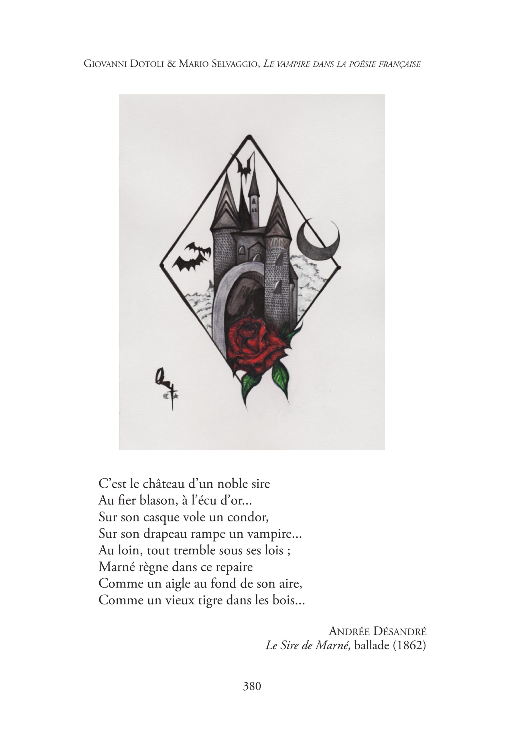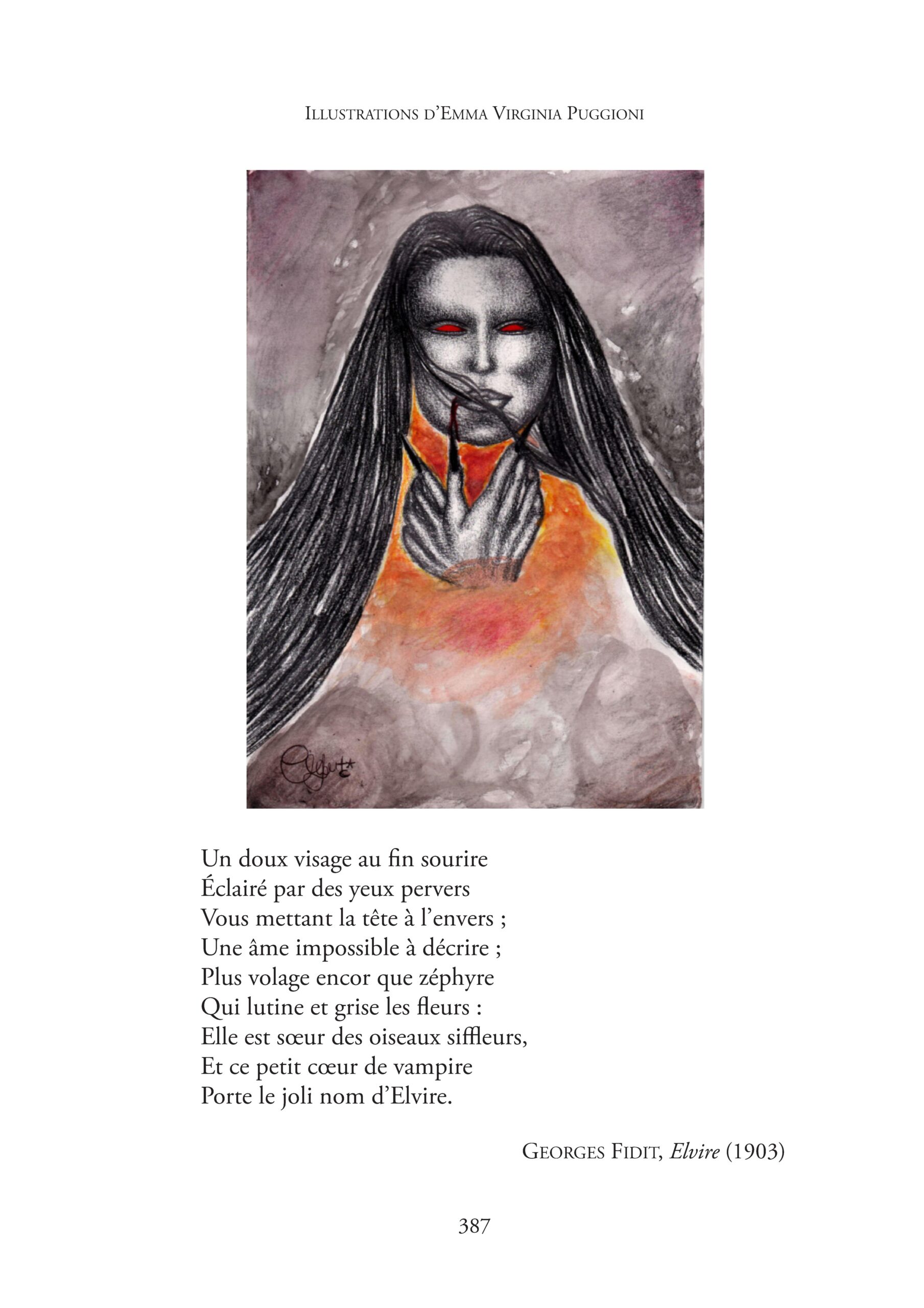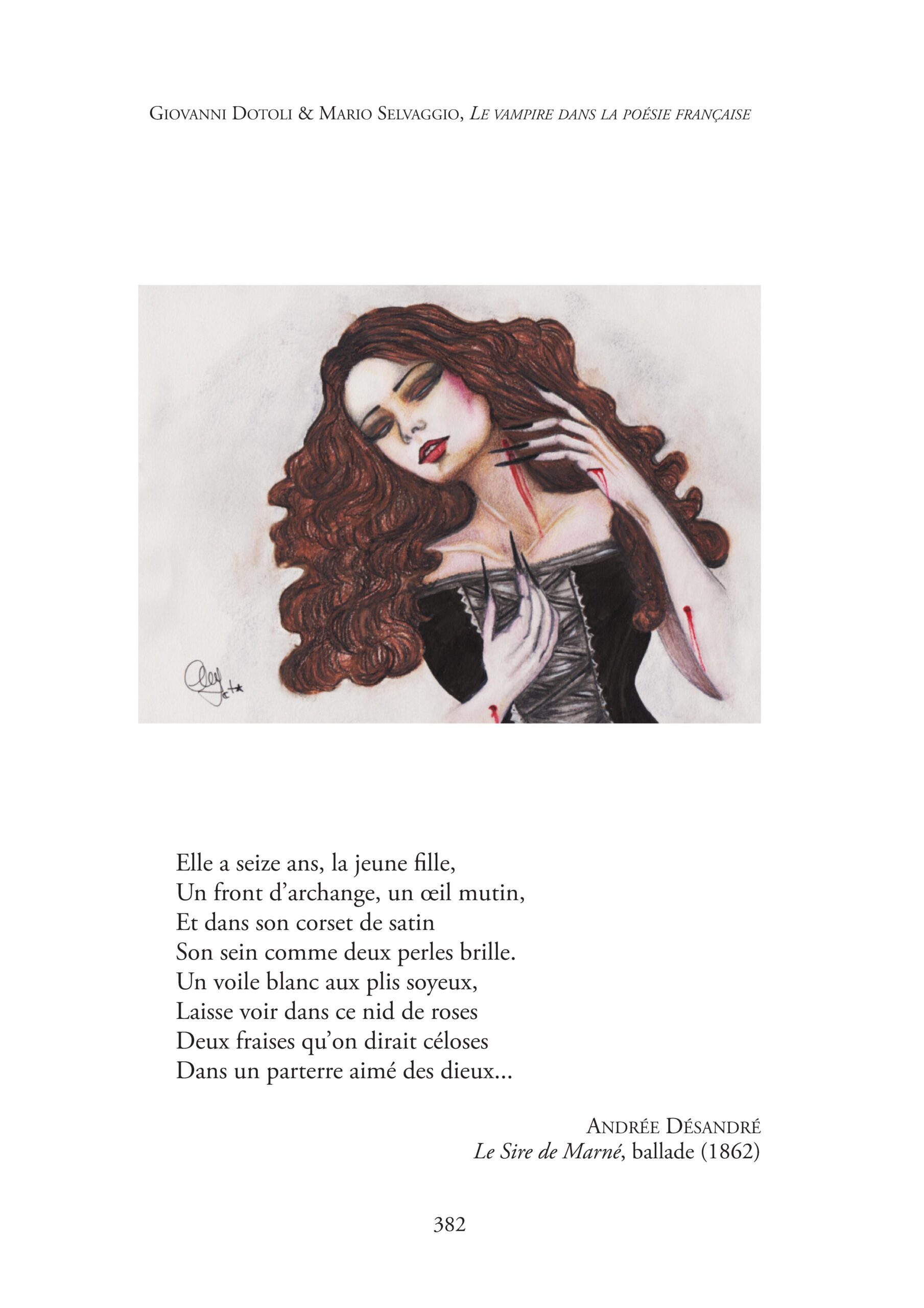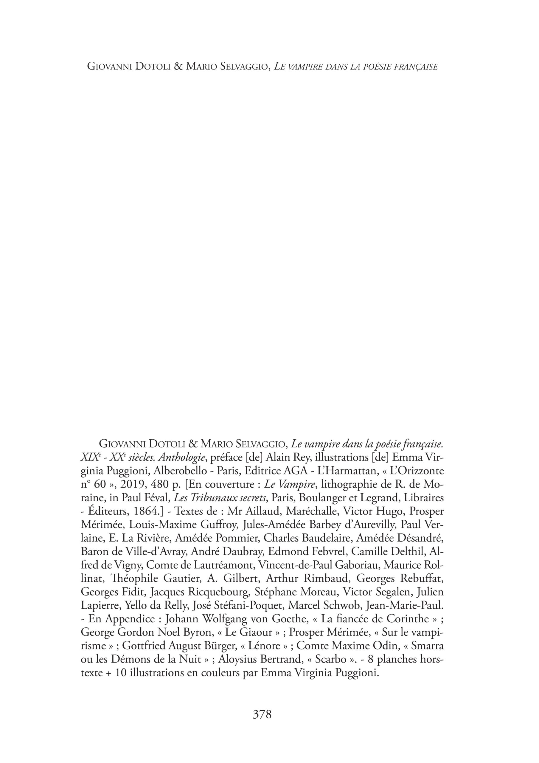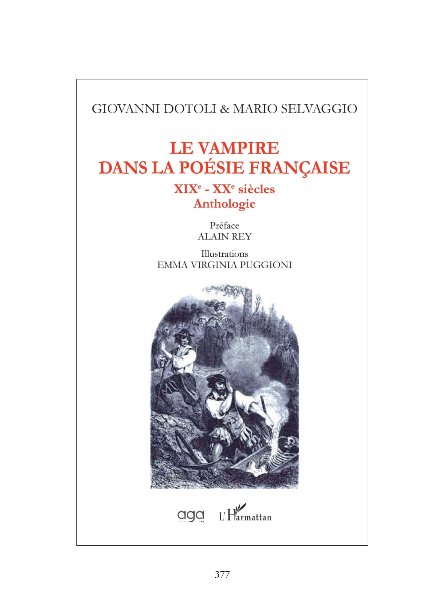 Giovanni Dotoli & Mario Selvaggio, “Le vampire dans la poésie française”, illustrations d’Emma Virginia Puggioni, « Noria. Revue littéraire et artistique », fondée et dirigée par Giovanni Dotoli et Mario Selvaggio, Paris – Alberobello, L’Harmattan – AGA Editrice, III, N° 3, Mars 2021, p. 377-388.